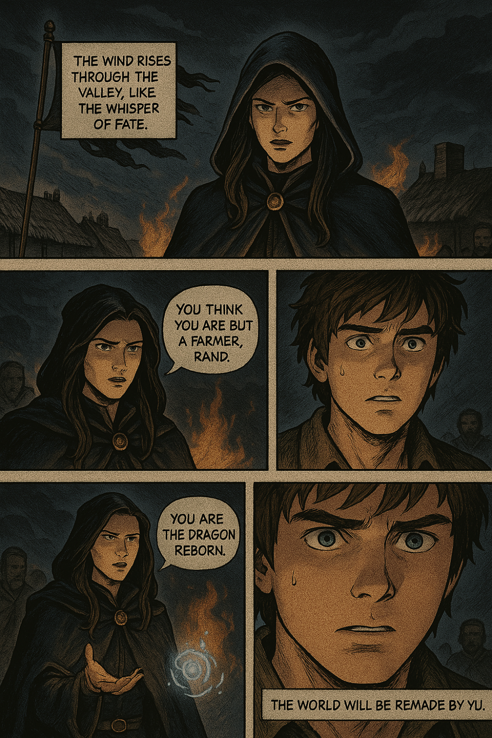 "You are the Dragon Reborn" — Rand hears his destiny, rendered in dramatic manga style with an emotional panel layout.